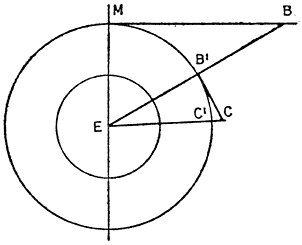 A glance at the accompanying figure will help to answer this question. We must remember that the moon is not stationary, but travelling at tremendous speed—so much so, that it circles the entire earth every month. Now if the earth [9]were absent the path of the moon would be a straight line, say MB. If, however, the earth exerts attraction, the moon would be pulled inward. Instead of following the line MB it would follow the curved path MB′. And again, the moon having arrived at B′, is prevented from following the line B′C, but rather B′C′. So that the path instead of being a straight line tends to become curved. From Kepler’s researches the probabilities were that this curve would assume the shape of an ellipse rather than a circle.
