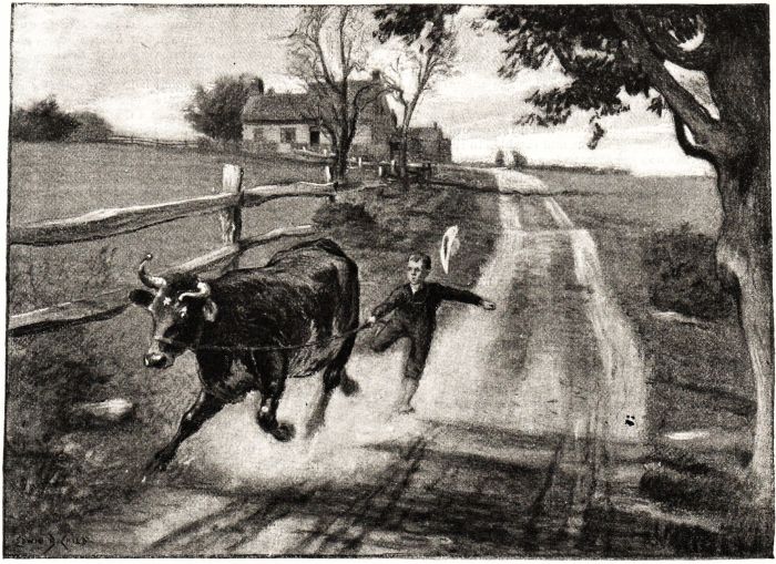 The boy had a thin sensitive face and curly brown hair, short trousers patched on both knees, and a ragged straw hat on the back of his head. He pattered along behind the cow, sometimes holding the rope with both hands, and getting over the ground in a jerky way, as the animal left him no time to think of a smooth path for bare feet. The Sanderson pasture was a good half-mile distant, I knew, and the cow seemed in no hurry to reach it; accordingly she forsook the road now and then, and rambled in the hollows, where the grass was sweeter, to her way of thinking. She started on one of these exploring expeditions just as she passed the great maple, and gave me time to call out to the little fellow, "Is that your cow?"