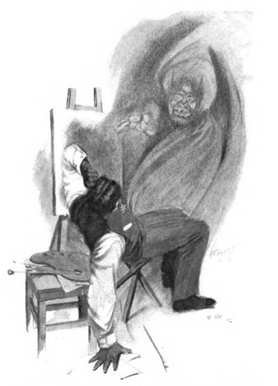 “During that year I met a woman who was the very type of all that is pure and innocent, and I even dared to think that sometime, after I had lived down my frightful past, I might make her my wife. But one day as I was[171] straining my eyes to catch the last light of the fading afternoon, I chanced to glance over the canvas, and, my God, there creeping out of the darkness, was that hideous thing. I was unconscious for several hours, but when I came to myself I consulted the best physician in Paris, and was under his care for over a month, but it was of no use. Since that day it has followed me everywhere, day and night. I tried to drown it in drink, and it only came the oftener. Then I sent the crowd home, and resolved to paint a likeness of the thing, to have always with me, so as to accustom myself to it, but it was too awful.” His voice trailed off into a shuddering whisper.