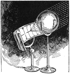 Another application of the burning-glass is to obtain a record of the number of hours of sunshine in each6 day. You will understand the apparatus from Fig. 3; the lens is here replaced by a glass globe, which acts as a burning-glass. As the sun moves over the sky the bright spot of light also moves, and therefore burns its track on a sheet of paper marked with lines corresponding to the hours. When the sun is hidden by clouds the burning ceases, so by preserving each day the piece of paper, we have an unerring tell-tale, which shows us during what hours the sun was shining brightly, and the hours during which he was hidden. You see, the burning-glass is not merely a toy, it can be made useful in helping us to learn something about the weather.