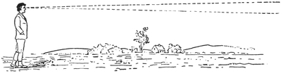 I ought here to explain a principle which those who are learning about the stars must always bear in mind. The principle asserts that the further a body is, the smaller it looks. Perhaps this will be understood from the adjoining little sketch (Fig. 8). It represents a great globe, on which oceans and continents are shown,26 and you see a little boy and a little girl are looking at the globe. The girl stands quite close to it, and I have drawn two dotted lines from her eye, one to the top of the globe, and the other to the under surface. If she wants to examine the entire side of the globe which is visible to her, she must first look along the upper dotted line, and then she must turn her glance downwards until she comes to the lower line, and having to turn her eyes thus up and down she will think the globe is very big, and she will be quite right. The boy is, as you see, on the other side of the globe, but I have put him much further off than the girl. I have also drawn two dotted lines from his eye to the globe, and it is plain that he will not have to turn his head much up and down to see the whole globe. He can take it all in at a glance, and to him, therefore, the globe will appear to be comparatively small, because he is sufficiently far from it. The more distant he is, the smaller it will appear. You can easily imagine that, if the globe were far enough, the two lines that would include the whole would be like those shown (Fig. 9), in which the globe is so distant that it cannot be seen in the picture. The apparent size of the globe, which is really measured by the angle between these two lines,27 would always be smaller and smaller according as the distance was greater. Now you can understand why an object seems smaller the further away it is; indeed, when sufficiently far, the object ceases to be visible at all.