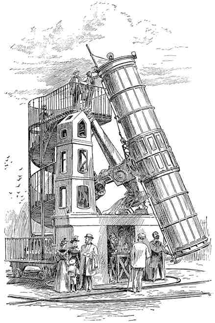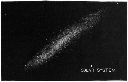 On the blackboard I draw a little circle with a piece of chalk. I think of our earth as the centre, and this circle will mark for us the limit to which our greatest telescopes can sound. Every star which we see, or which the photographic plate sees, lies within this circle; but, are there no stars outside? It is true that we can never see them, but it is impossible to believe that space is utterly void and empty where it lies beyond the view of our telescopes. Are we to say that inside this circle stars, worlds, nebulæ, and clusters are crowded, and that outside there is nothing? Everything teaches us that this is not so. We occasionally gain accession to our power by adding perhaps an inch to the diameter of our object-glass, or by erecting a telescope in an improved situation on a lofty mountain peak, or by procuring a photographic plate of increased sensibility. It thus happens that we are enabled to extend our vision a little378 further and to make this circle a little larger, and thus to add a little more to the known inside which has been won from the unknown outside. Whenever this is done we invariably find that the new region thus conquered is also densely filled with stars, with clusters, and with nebulæ; it is thus unreasonable to doubt that the rest of space also contains untold myriads of objects, even though they may never, by any conceivable improvement in our instruments, be brought within the range of our observation. Reflect that this circle is comparatively small with respect to the space outside. It occupied but a small spot on this blackboard, the blackboard itself occupies only a small part of the end of the theatre, while the end of the theatre is an area very small compared with that of London, of England, of the world, of the solar system, of the actual distance of the stars. In a similar way the region of space which is open to our inspection is an inconceivably small portion of the entire extent of space. The unknown outside is so much larger than the known inside, it is impossible to express the proportion. I write down unity in this corner and a cipher after it to make ten, and six ciphers again to make ten millions, and again, six ciphers more to make ten billions; but I might write six more, ay, I might cover the whole of this blackboard with ciphers, and even then I should not have got a number big enough to express how greatly the extent of the space we cannot see exceeds that of the space we see. If, therefore, we admit the fact, which no reasonable person can doubt, that this outside, this unknown, this unreachable379 and, to us, invisible space does really contain worlds and systems as does this small portion of space in which we happen to be placed—then, indeed, we shall begin truly to comprehend the majesty of the universe. What figures are to express the myriads of stars that should form a suitable population for a space inconceivably greater than that which contains 100,000,000 stars? But our imagination will extend still further. It brings before us these myriads of unseen stars with their associated worlds, it leads us to think that these worlds may be full to the brim with interests as great as those which exist on our world. When we remember that, for an adequate description of the worlds which we can see, one hundred thousand libraries, each greater than any library on earth, would be utterly insufficient, what conception are we to form when we now learn that even this would only amount to a description of an inconceivably small fragment of the entire universe?
