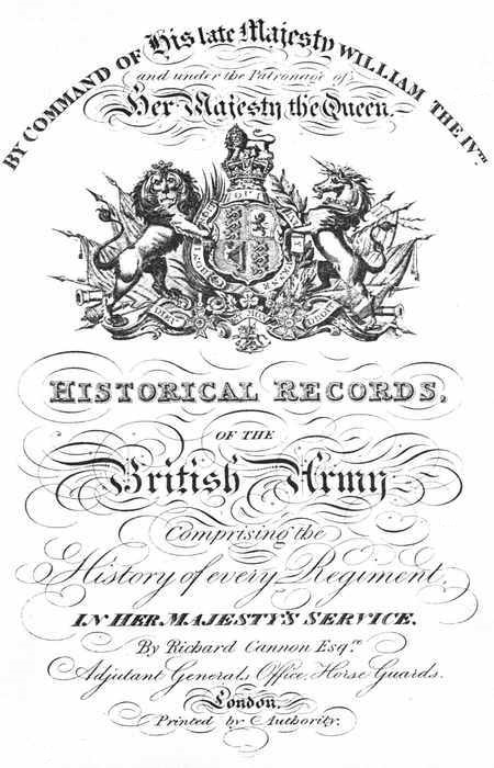 These Records are now preparing for publication, under His Majesty’s special authority, by Mr. Richard Cannon, Principal Clerk of the Adjutant General’s Office; and while the perusal of them cannot fail to be useful and interesting to military men of every rank, it is considered that they will also afford entertainment and information to the general reader, particularly to those who may have served in the Army, or who have relatives in the Service.