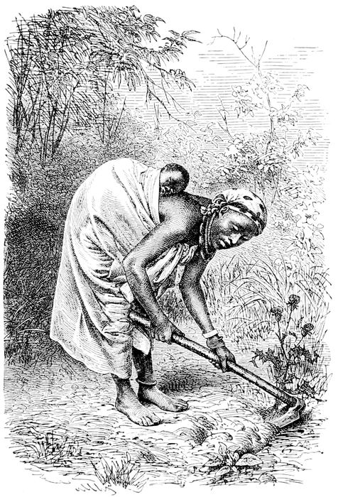 Having cleaned a suitable spot women made with their primitive digging sticks the holes, into which they sunk the 18seeds, from which the plants were expected to develop. Experience, the mother of all wisdom, taught women that these plants needed constant attention. So the ground was kept free from weeds and properly watered. From time to time it was loosened with hoes, which in the beginning were made of bones, shells or stones, and later on of metal.