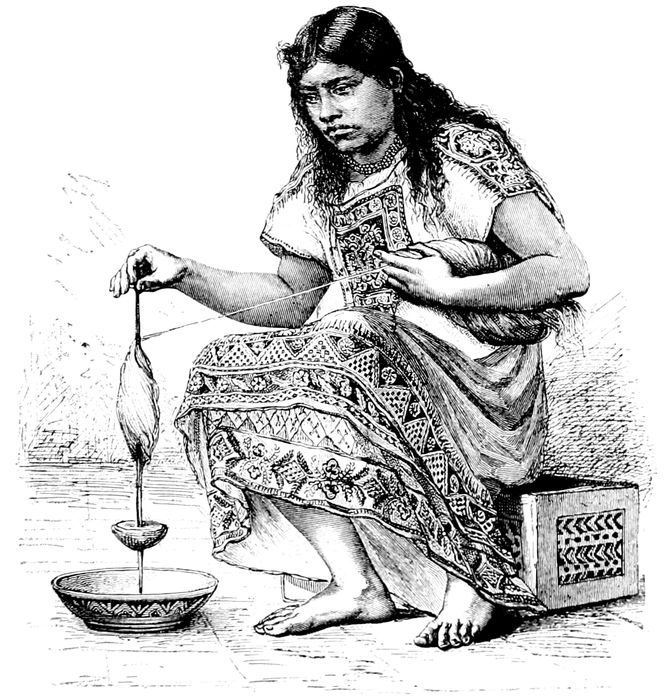 Similar observations led to the art of weaving. The nets, spread out everywhere by spiders for the capture of insects, gave women the first hint to make similar fabrics for the capture of birds and fishes. The spider’s thread was imitated by long hair and the fibres of certain plants. These were twisted together in a manner similar to that used by the weaver-birds in constructing their airy nests.