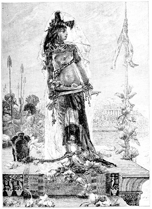 Herodotus and other historians of classic times relate that every year in Egypt, when the Nile began to rise, to which that country owes its abundance, the priests persuaded a beautiful girl to become the bride of the river-god. Adorned with jewels and flowers, and greeted by all the people, this virgin was led to the flat roof of a temple overlooking the mighty river. After prayers and invocations had been made, she was tossed into the swirling floods, which swiftly carried her away.