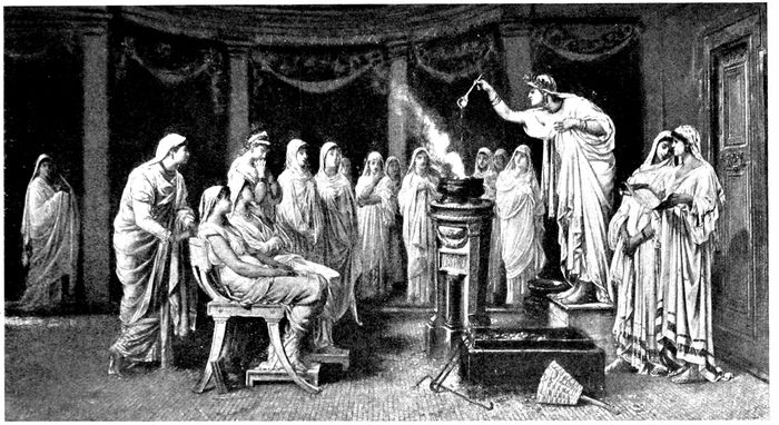 To such institutions belonged also, what by some students of human culture has been characterized as “hierarchical or sacred prostitution.” As is generally known, there exist among almost all aboriginal tribes crafty charlatans, who pretend to have influence over those supernatural powers, which are believed to be the distributors of all blessings as well as of all evils. These so-called sorcerers, healers, conjurors, magicians, medicine-men, or shamans, the predecessors of the priests, usurped among many tribes the privilege of deflouring all virgins before their entrance into marriage. With the gradual evolution of priesthood this practice was made a rite, which among various nations of antiquity developed into the most voluptuous orgies known in history.