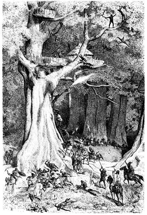 The ape-man probably knew no other shelter than nests of twigs and leaves, similar to those constructed by the orang outang and the gorilla. But with the gradual development of man’s brain and intelligence he improved these nests to 10tree-huts like those still used by certain aborigines of New Guinea, India, and Central Africa. To these huts they retreated at night, to be safe from wild beasts, and also at sudden attacks by superior enemies.
