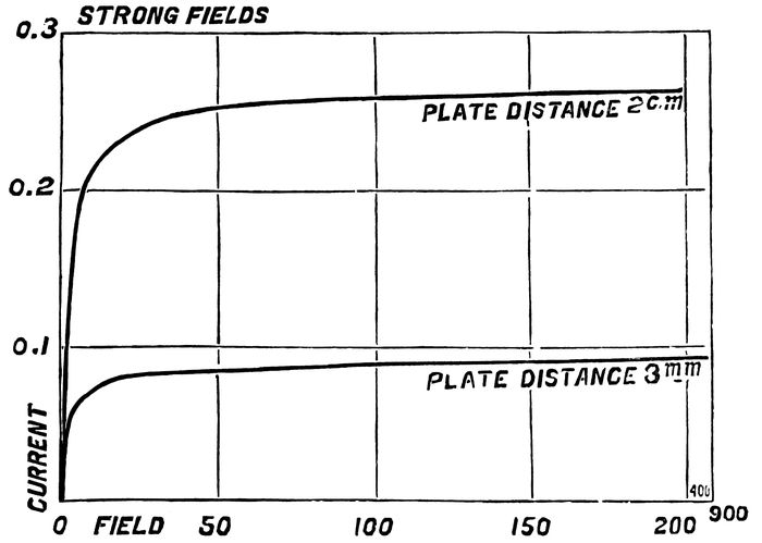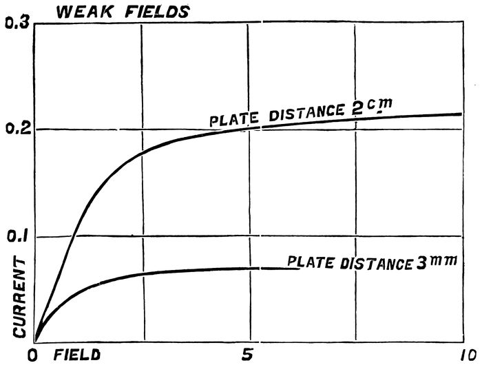 Secondly, in order to obtain the limiting current relatively to a given radiation, it is necessary, on the one hand, to cause complete absorption of this radiation by the gas by employing a sufficient mass of it; on the other hand, it is necessary for the production of the current to use all the ions generated by establishing an electric field of such strength that the number of the ions which recombine may be a negligible fraction of the total number of ions produced in the same time, most of which are carried by the current to the electrodes. The strength of the electric field necessary to give this result is proportional to the amount of ionisation.