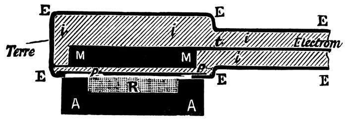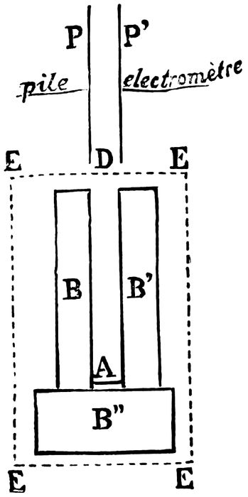 But a preferable method of measurement is that of compensating the charge on plate A, so as to cause no deflection of the electrometer. The charges in question are extremely weak; they may be compensated by means of a quartz electric balance, Q, one sheath of which is connected to plate A and the other to earth. The quartz lamina is subjected to a known tension, produced by placing weights in a plate, π; the tension is produced progressively, and has the effect of generating progressively a known quantity of electricity during the time observed. The operation can be so regulated that, at each instant, there is compensation between the quantity of electricity that traverses the condenser and that of the opposite kind furnished by the quartz. In this way, the quantity of electricity passing through the condenser for a given time, i.e., the intensity of the current, can be measured in absolute units. The measurement is independent of the sensitiveness of the electrometer.