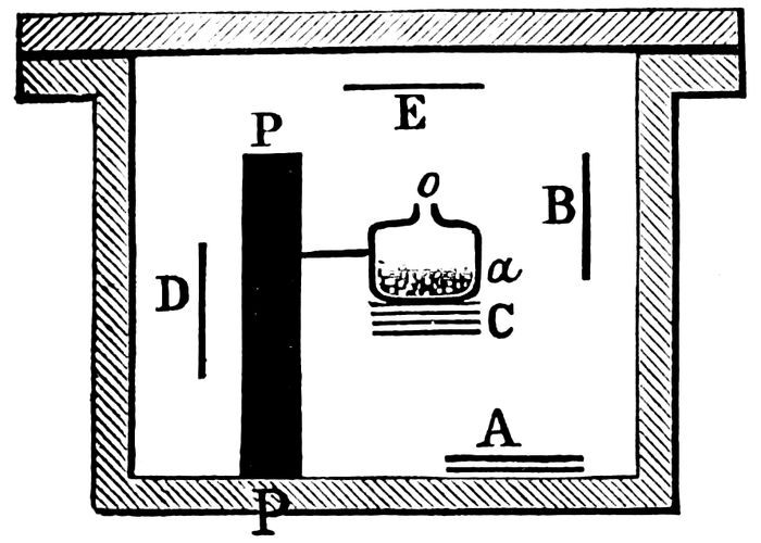 The method employed consists in measuring the conductivity acquired by air under the action of radio-active bodies; this method possesses the advantage of being rapid and of furnishing figures which are comparable. The apparatus employed by me for the purpose consists essentially of a plate condenser, A B (Fig. 1). The active body, finely powered, is spread over the plate B, making the air between the plates a conductor. In order to measure the conductivity, the plate B is raised to a high potential by connecting it with one pole of a battery of small accumulators, P, of which the other pole is connected to earth. The plate A being maintained at the potential of the earth by the connection C D, an electric current is set up between the two plates. The potential of plate A is 8recorded by an electrometer, E. If the earth connection be broken at C, the plate A becomes charged, and this charge causes a deflection of the electrometer. The velocity of the deflection is proportional to the intensity of the current, and serves to measure the latter.