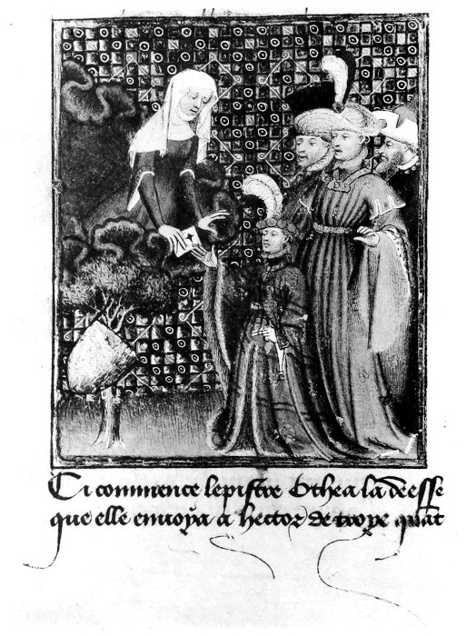 Before commenting upon the English translation something must be said of the original “Épître d’Othéa” and the remarkable woman who was its author.[5] In no sense was Christine de Pisan French by birth. Her father Thomas de Pisan, or de Boulogne, was, as she tells us,[6] a native of Bologna, and he may reasonably be identified with Tommaso di Benvenuto di Pizzano, who was Professor of Astrology there between 1345 and 1356.[7] Later he obtained the salaried office of State Councillor at Venice, where also he married, and where Christine, probably the eldest of his three children and the only girl, was born in 1364.[8] It was shortly after her birth that he was prevailed upon by the French king Charles V. to remove to Paris, and the fact that Louis the Great of Hungary was equally anxious to attract him to Buda shows how widely the fame of his learning and science had spread.[9] For fifteen years he had no cause to regret his change of country, for Charles not only made him his physician and astrologer with handsome emoluments, but treated him altogether with marked distinction. Christine, who with her mother joined him at the end of 1368, was thus brought up at the most brilliant and intellectual xiicourt of the time, and when, at the early age of fifteen, she was married to Étienne du Castel in 1379, her ties with it were further strengthened by her husband’s appointment as secretary to the king. This prosperity was rudely interrupted by the premature death of Charles V. on 16th September, 1380. In her own words, “Or fu la porte ouverte de noz infortunes, adonc faillirent à mon dit père ses grans pensions.”[10] Thomas de Pisan in fact was growing old and out of fashion; with the loss of his place at court and its prestige he soon fell into neglect, and when in a few years he died, his wife and two sons were left dependent upon his daughter and son-in-law. Happily the latter still retained his post under the new king, and if he had lived all might have gone well, though possibly in that case Christine’s latent powers would never have been called into activity. As a climax, however, to her misfortunes Étienne du Castel was carried off by an epidemic at Beauvais in 1389, and she thus found herself a widow at twenty-five with three children besides others[11] to support out of what little she could rescue from the claimants to her husband’s estate.