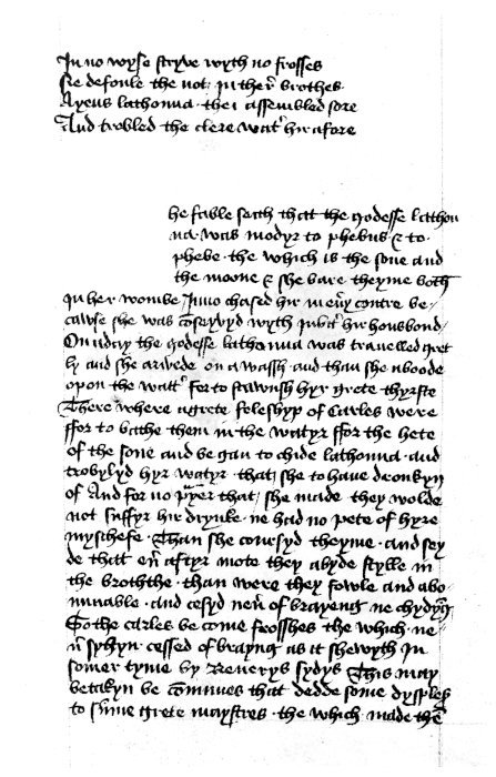 Athamas was a kyng maried to qwene Yno, the which made sothyn[219] corne to be sowne for to disheryte hyr[220] stepe childire, for she[221] with mony coromped the prestes of the lawe, the which reported the answeres of the godes, thus seyyng to the kyng or to theyme of the cuntre that the corne that the men hadden sowene profyted not, where it plesyd the godes that .ii.o fayre and ientyl childir the whiche the kyng hade were dreven away and exiled. And becawse that the kyng consentyd [to] the exillyng of the .ii.o childyrne, all though that he dyde [it] ayens hys wylle and wyth grete sorowe, the fabyl seyth that the godes Iuno[222] wolde take vengance therefor and went into helle to compleyne to the godesse 30of woodnes that sche myght come to the kyng Athamas. Than the orrible and the fereful goodes come with all hir serpently herres and sette hyr on the fumerelle[223] of the palais and streged hir armes to bothe sydys of the yate, and than there began sych stryfe betwene the kyng and the qwene that werrant[224] yche of them hade slayne othir. And whan they wend a hade rune oute of the palais, than þe woode goodes drwe out of hyr ryght foule herres .iio. horrible serpentis and kest in there lappes; and qwen that the goodes saw theyme so ferefull,[225] than they wexe both madde. Athamas slewe the qwene for woodnes and than his .ii.o childerne, and hym selfe leep into the see of frome a h[i]ght roche. The exposycion of this fable may wele be that a qwen myght be so dyuers to stepe chyldirne that for some malice she myght disheryte hem, for the which after pes myght notte be hadde betwene the fadir and the steppe modir. And it myght be soo that at the last he slewe theyme. And because that ire is a dedly vice and soo evyle that he that is sore teynt therewyth hath no knowyng of reson, it is seide to the goode knyght that he shuld kepe hym from ire, for it is too grete defaute in a goode knyght to be angry. And there[fore] Arystotile seithe “Kepe the from ire, for it trobelyth the vndyrstondyng and destroubeth reson.”