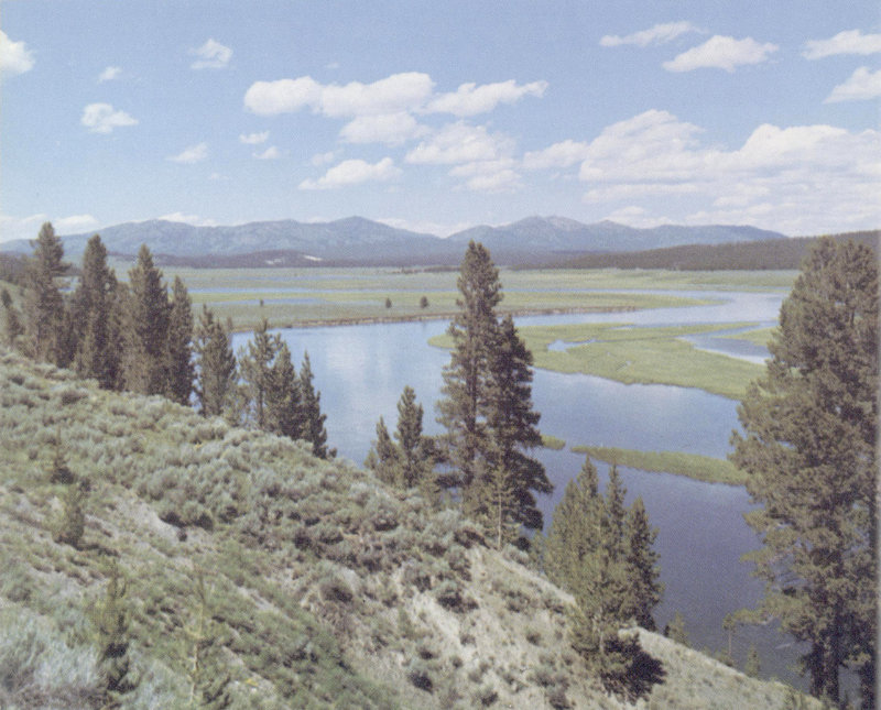 HAYDEN VALLEY. View north along the Yellowstone River and Hayden Valley toward the Washburn Range. Mount Washburn, part of an ancient Absaroka volcano, is the highest prominence (elevation, 10,293 feet) on the skyline to the right, and Dunraven Pass is in the notch in the center of the skyline. The foot of the range marks the north edge of the Yellowstone caldera. Hayden Valley is cut in glacial lake sediments that overlie thick lava flows covering the caldera floor. (Fig. 4)