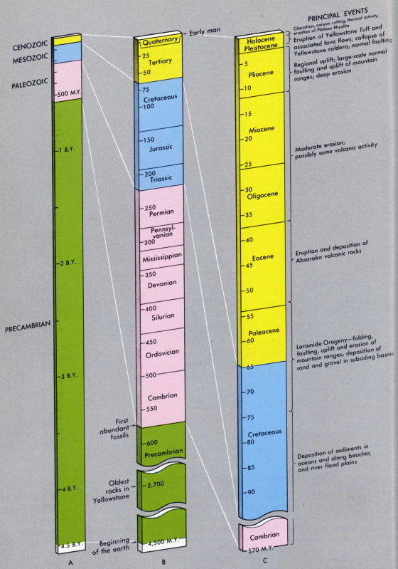 Figure 5 shows the many different rock units that have been recognized in Yellowstone National Park. Arranged in a vertical column according to the geologic time intervals in which they formed, these rocks represent a large part of total earth history (fig. 6). A generalized geologic map (plate 1) shows the distribution of the various units (or groups of closely related units) exposed at the surface throughout the Park area. This map and figure 5 summarize much of the information that is necessary to interpret the Park’s geologic history—in essence, to provide answers to these two important questions: What were the geologic events that formed the rocks? When did these events occur?