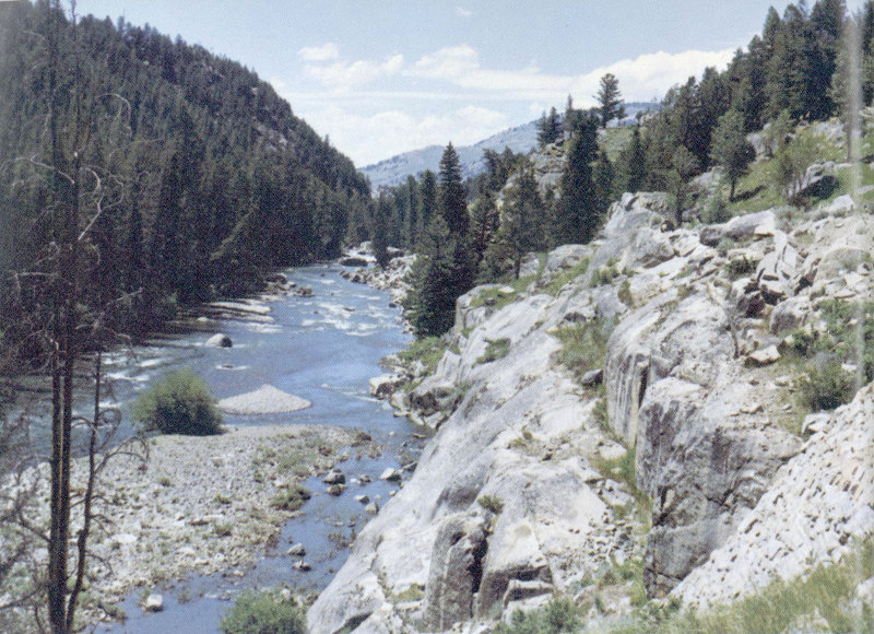 Many stretches of the main river valleys in Yellowstone are broad and flat bottomed. In these, the stream gradients range from about 10 to 30 feet per mile, and there is little erosion going on at present (Hayden Valley is a good example, fig. 4). But here and there the gradients are steeper, and the valleys are narrow and rugged. In some places these streams drop 50 or even 100 feet per mile, and the fast-moving waters have carved deep V-shaped gorges (fig. 36).