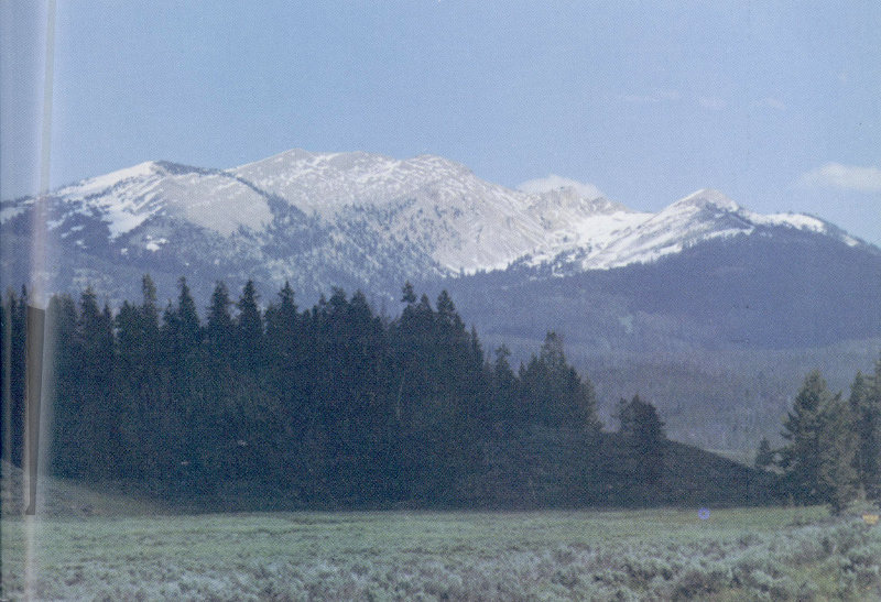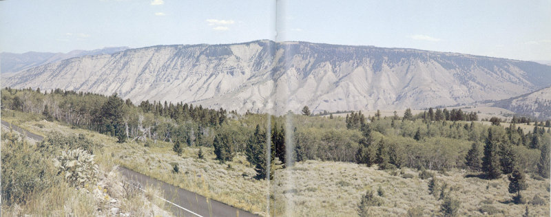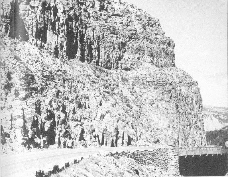 SKYLINE OF THE GALLATIN RANGE in northwestern Yellowstone National Park, as viewed from a point on the road between Canyon Village and Norris Junction. The range consists chiefly of Paleozoic and Mesozoic sedimentary rocks and Precambrian metamorphic rocks that were uplifted by folding and faulting of the earth’s crust. The dark-gray rocks along the roadcut in the left foreground are rhyolite lava flows of the Solfatara Plateau. (Fig. 3)