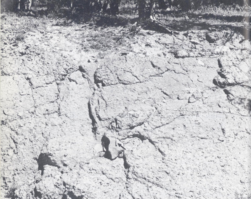 After their maximum advance, the Pinedale glaciers began to melt, leaving behind the rock debris they had gouged from the landscape and had pushed or carried along with them. These glacial moraines are now found in many areas throughout the Park. In places, glacial ice and (or) rock debris formed natural dams across stream valleys, thereby impounding lakes. Parts of Hayden Valley, for example, contain layers of very fine sand, silt, and clay several tens of feet thick (fig. 39) that accumulated along the bottom of a large lake. This lake formed behind a glacial dam across the Yellowstone River near Upper Falls. Some of the glacial dams broke and released water catastrophically, causing giant floods; the occurrence of one such flood is particularly evident along the Yellowstone River valley near Gardiner, Montana.