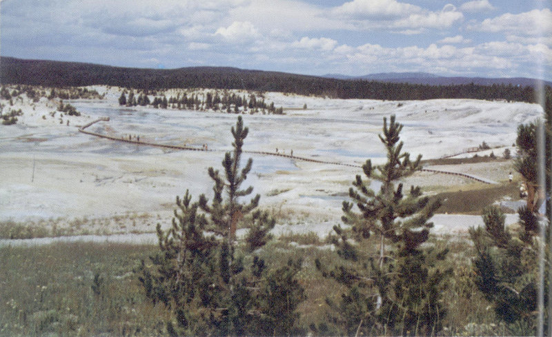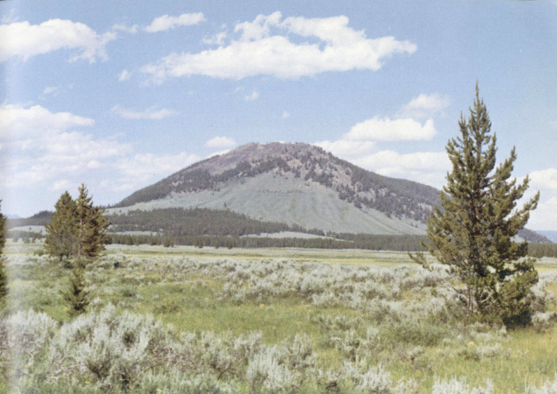 NORRIS GEYSER BASIN, as viewed northward from the Norris Museum. This is one of the most active thermal areas in Yellowstone, but the photograph was taken on a warm dry summer day when little hot-water and steam activity was visible from a distance. Clouds of water droplets (the visible “steam” in thermal areas) normally form only when the air is cool and (or) moist. The floor of the basin is covered by a nearly solid layer of hot-spring deposits. (Fig. 44)