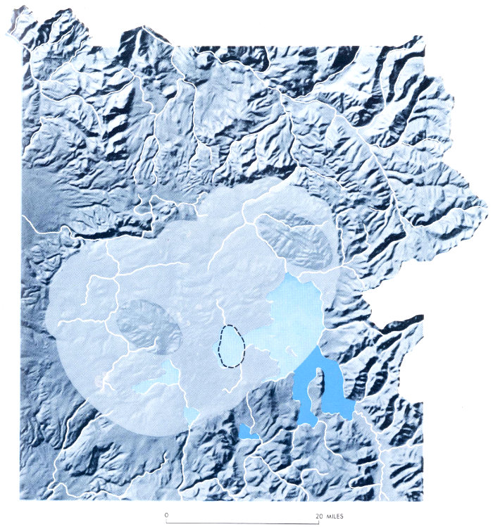 Thus, in one brief “moment” of geologic time there was launched that incredible chain of events which led to the creation of many of the natural wonders of Yellowstone National Park. Heat from the enormous reservoir of molten rock which produced the massive eruption still remains deep within the earth beneath Yellowstone, sustaining the spectacular hot-water and steam phenomena for which the Park is so justly famous. The formation of the caldera and the eruption of lavas profoundly influenced the shape of the present-day landscape. Once a land covered almost entirely by mountains, the part that collapsed—nearly one-third of the total Park area—is now characterized by low rolling plateaus formed from the thick lava flows that filled the caldera (figs. 1 and 2; see fig. 22 for the outline of the Yellowstone caldera). Moreover, the carving of the spectacular Grand Canyon of the Yellowstone (fig. 41) and the fashioning of the large interior basin now occupied by beautiful Yellowstone Lake (fig. 27) were closely related to this mighty volcanic event.