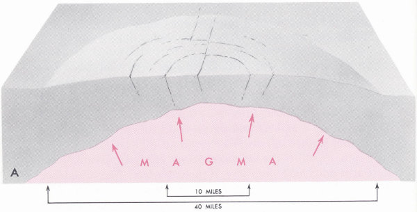 Some 600,000 years ago the rumblings of an impending volcanic eruption sounded ominously across the Yellowstone country. Suddenly, in a mighty crescendo of deafening explosions, tremendous quantities of hot volcanic ash and pumice spewed from giant cracks at the earth’s surface. Towering dust clouds blackened the sky, and vast sheets of volcanic debris spread out rapidly across the countryside in all directions, covering thousands of square miles in a matter of minutes with a blanket of utter devastation. Abruptly, a great smoldering pit—a caldera 30 miles across, 45 miles long, and several thousand feet deep—appeared in the central Yellowstone region, the ground having fallen into the huge underground cavern that was left by the earth-shaking eruptions. Lava then began oozing from the cracks to fill the still-smoking caldera.