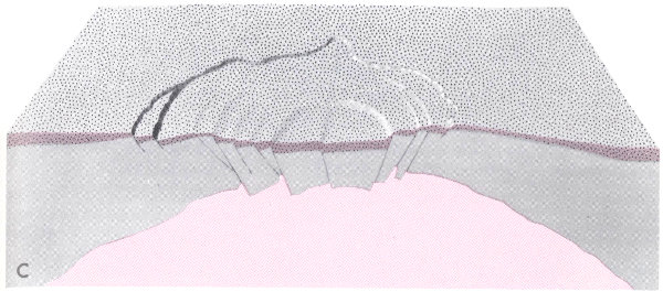 If we were to walk backward in time at the rate of one century per step, the first step would return us to 1872, the year that Yellowstone National Park was established. But to return to the oldest recorded event in its geologic history, we would have to walk (at 3 feet per step) some 15,000 miles, or three-fifths of the way around the world! Occurring far back in the antiquity of the Precambrian Era—approximately 2.7 billion years ago according to radiometric dating (fig. 6)—the oldest event resulted in rocks so crumpled and changed by heat and pressure that their original character is obscure. These rocks, having been transformed from still older ones, are called metamorphic rocks. Considered to form part of the very foundation of the continent itself, they are also commonly referred to as basement rocks.