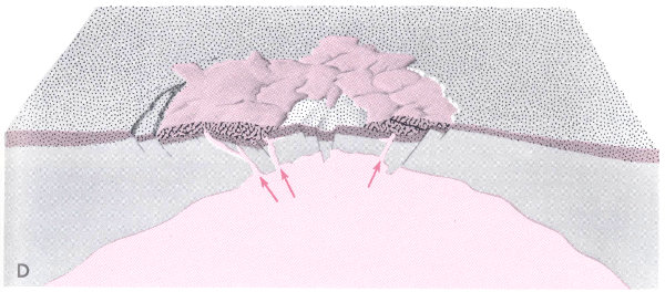 At first glance, the canyon may appear to be a giant crack which suddenly opened up and into which the Yellowstone River then plunged headlong over high waterfalls at its southwest end. This, of course, is not the way the canyon formed. Nevertheless, it is apparent that certain unusual conditions caused the river, after winding slowly through flat-floored Hayden Valley for about 13 miles, to cut a precipitous gorge 1,000-1,500 feet deep and 20 miles long (fig. 42C). A full explanation must be based on all the many events surrounding the eruption of the Yellowstone Tuff, the collapse of the Yellowstone caldera, the outpouring of the Plateau Rhyolite, and the various episodes of glaciation. Geologic studies show that all these events took place while the canyon was being cut, and that each one played an important role in its development. Hot-water and steam activity likewise was a significant factor. However, despite its many complexities, the history of the Grand Canyon can be divided into a few major stages, as outlined below: