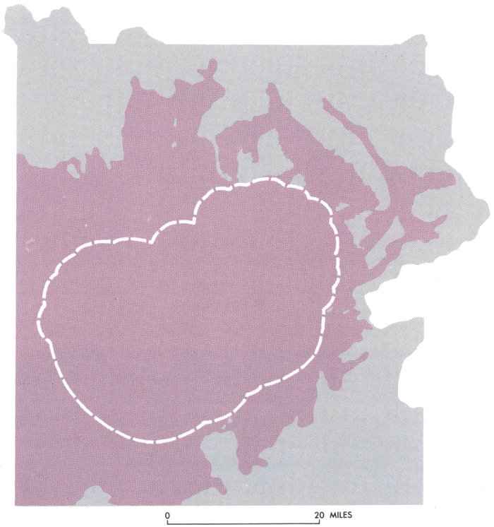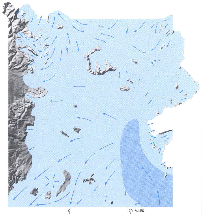 EXTENT OF ICE in Yellowstone National Park during the maximum spreading of the Pinedale glaciers, probably about 15,000 years ago. Long arrows indicate direction of strong flowage of ice; short arrows show direction of less vigorous ice flowage. The dark-blue area shows the main ice mass centered over the Yellowstone Lake basin in the southeast corner of the Park. Many of the high peaks and ridges such as Mount Washburn, which are here shown free of ice, were glaciated at least once during the past 250,000 years. Whether they were covered by the Pinedale glaciers, however, is still an unresolved question. (Based on information supplied by G. M. Richmond, K. L. Pierce, and H. A. Waldrop.) (Fig. 38)