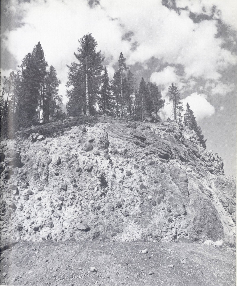 SEISMIC GEYSER, showing rock rubble blown out during an explosive thermal eruption. Note the trees that have been killed by the heat and eruptive activity. According to George D. Marler of the National Park Service, this geyser developed from cracks caused by the Hebgen Lake Earthquake of August 17, 1959. (Fig. 51)