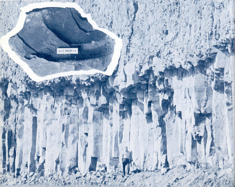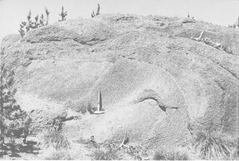 GIANT BOULDER (glacial erratic) of Precambrian gneiss near Inspiration Point on the north rim of the Grand Canyon. The boulder, measuring 24×20×18 feet and weighing more than 500 tons, was dropped at this locality by glacial ice; it now rests on the much younger Plateau Rhyolite. The distance that the boulder was carried or pushed was at least 15 miles. (Fig. 34)