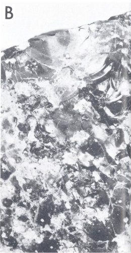 The position of Lower Falls, as might be expected, coincides with a change from highly altered to less altered rhyolite; the difference in the erosion rates of the two kinds of rocks here is self-evident (figs. 41 and 42C). The position of Upper Falls is likewise closely controlled by differences in rock hardnesses. The rhyolites on the upstream side are hard and dense, whereas those on the downstream side contain a high proportion of volcanic glass which causes them to be more easily eroded (fig. 42C).