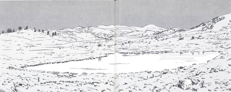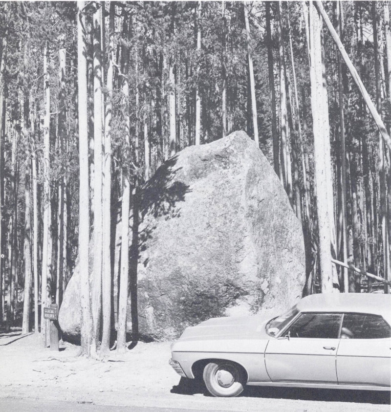 GLACIATED TERRAIN along the Northeast Entrance road. The boulders, many of them measuring 10 feet across or more, were carried into the area by ice flowing down Slough Creek from mountains north of the Park during the Pinedale Glaciation. As the glaciers melted, the boulders were left stranded in hummocky, morainal deposits. Shallow depressions in the irregular topography are now commonly filled by small ponds. (Fig. 35)