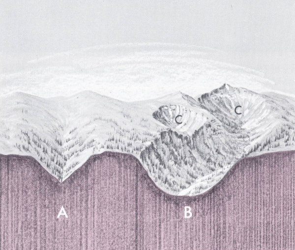 For the next 10,000 years, the ice thickened and spread out over more and more of the Park area. The mass centered over the Yellowstone Lake basin grew to a depth of 3,000 feet or more and dominated the entire scene; it formed a broad “mountain” of ice which became so high that it caused more snow to fall upon itself and was cold enough to prevent much of this snow from melting. Eventually the Pinedale glaciers covered about 90 percent of Yellowstone (fig. 38).