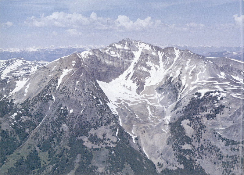 GLACIAL CIRQUE on east face of Electric Peak, northern Gallatin Range. During several episodes of glaciation, this steep-walled amphitheaterlike valley was cut and filled by ice which fed glaciers moving downslope to the lower right. The cirque floor is now covered by a thick deposit of rock rubble underlain in part by ice, and the whole mass is still moving slowly downhill as a rock glacier. The dark rock at lower right is part of the Electric Peak stock, composed of diorite (fig. 20) and other kinds of intrusive igneous rocks. The rocks in the cirque walls are chiefly Cretaceous shales (light to moderately dark color) with thin sills of igneous rock (very dark color). (West-looking oblique aerial photograph, courtesy of William B. Hall, University of Idaho.) (Fig. 37)