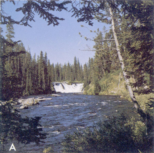 A, Lewis Falls on the Lewis River. The falls cascade over the steep edge of a rhyolite lava flow.