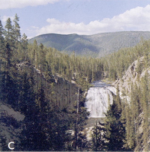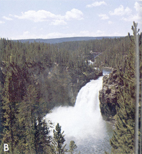 C, Gibbon Falls on the Gibbon River. The river tumbles over a scarp etched in the Yellowstone Tuff. The scarp first formed along faults at the north edge of the Yellowstone caldera 600,000 years ago, at a point that now lies ¼ to ½ mile downstream. Continued erosion has caused the falls to recede northward to their present position.