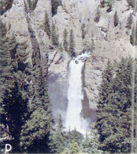 D, Tower Falls on Tower Creek. The rocks at the brink of the falls, and in the vertical cliff beneath, are coarse breccias and conglomerates of the Absaroka volcanic rocks. The channel of Tower Creek has not been cut down rapidly enough to keep pace with the downcutting of the main channel of the Yellowstone River, which lies a short distance downstream from the base of the falls.