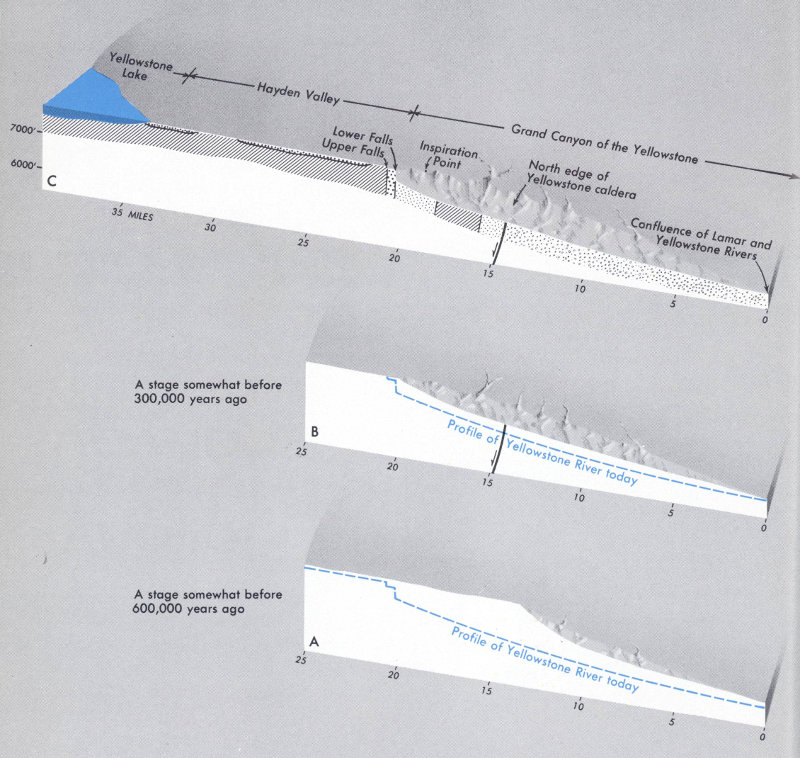 6. Canyon development was further interrupted by the advance and retreat of glaciers during Bull Lake and Pinedale Glaciations. During and since the melting of the Pinedale glaciers about 12,000 years ago, the canyon has attained its present depth, and its walls have acquired much of their picturesque erosional form. The Yellowstone River now maintains a fairly uniform gradient (60-80 feet per mile) throughout the 20-mile-long gorge, even though different segments of the canyon were cut at different times and through different kinds of rocks (fig. 42C).