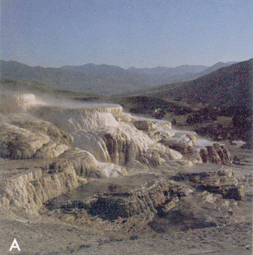 A, Hot springs and terraces colored by algae at Mammoth Hot Springs.