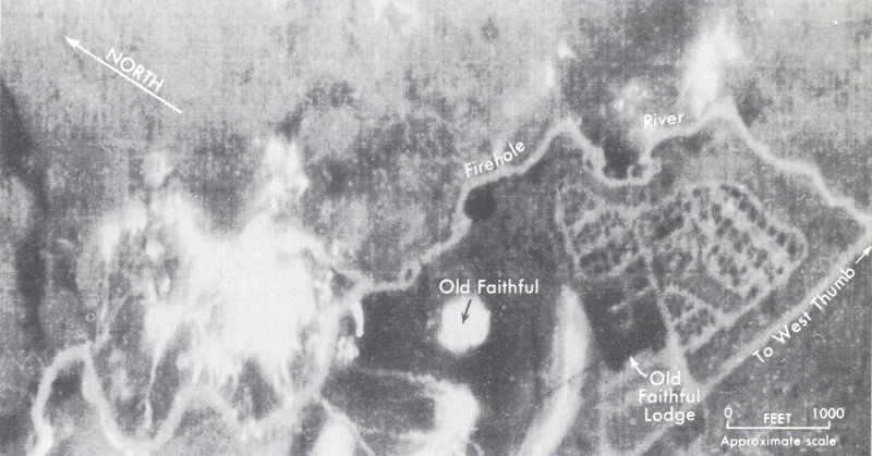 INFRARED IMAGE of a part of Upper Geyser Basin. Infrared instruments, sensitive to heat, are able to detect “hot” spots in the landscape. Note especially the sharp “image” of Old Faithful. (Image courtesy of National Aeronautics and Space Administration.) (Fig. 46)