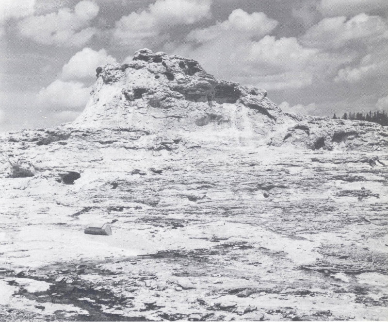 MOUND OF SINTER at Castle Geyser, Upper Geyser Basin. Lower part of mound has well-defined layers probably deposited by normal hot springs. The upper, irregular part resulted from the vigorous eruptions characteristic of geysers and marks a change in the local hot-spring activity. (Fig. 47)