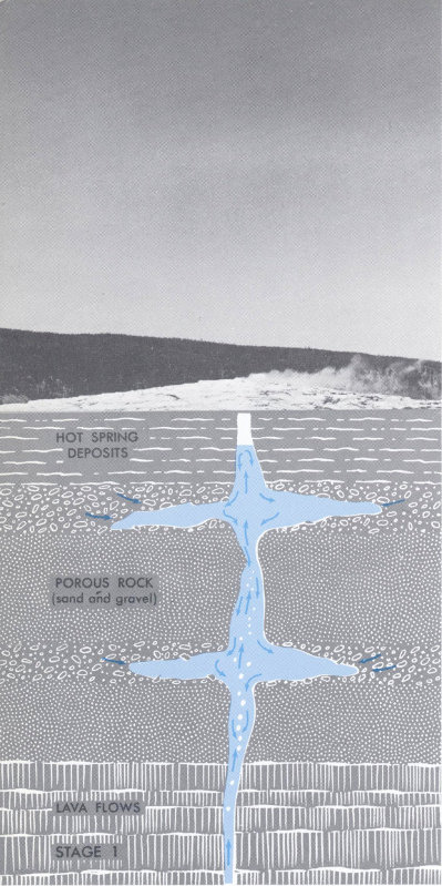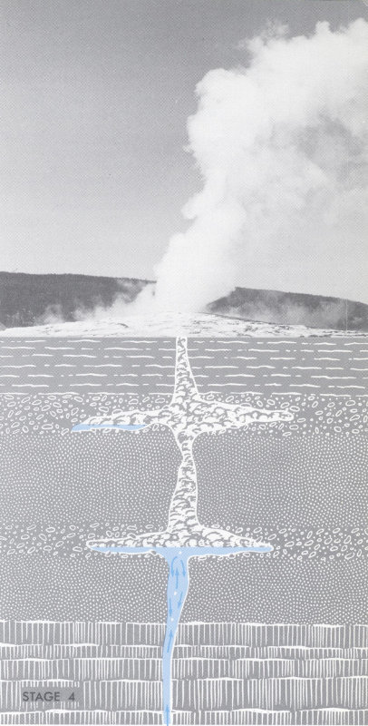 Considering a geyser system as described above and applying what is known about the behavior of water and steam, we can understand what causes a natural thermal eruption. Figure 50 shows diagrammatically the succession of events believed to occur during the typical eruptive cycle of a geyser such as Old Faithful.