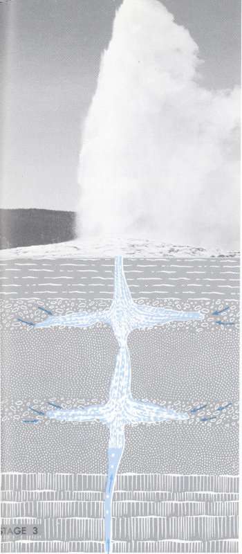 A GEYSER IN ACTION. Photographs of successive stages in the eruption of Old Faithful illustrate what probably happens during a natural geyser eruption. The underground plumbing is diagrammatic and does not reflect any specific knowledge of Old Faithful’s system. Direction of flow of water is shown by arrows. (Based on information supplied by D. E. White, L. J. P. Muffler, R. O. Fournier, and A. H. Truesdell.) (Fig. 50)