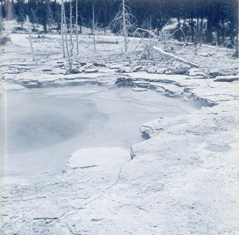 Through centuries of intense activity, layers of sinter have built up on the floors of the geyser basins (fig. 44); these deposits are generally less than 10 feet thick. In one drill hole at Mammoth, deposits of travertine extend to a depth of 250 feet. Dead trees and other kinds of vegetation whose life processes have been choked off by the heat, water, and precipitated minerals of hot-spring activity are a common sight in many places (fig. 51).