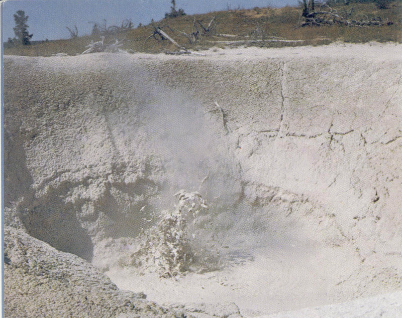 MUD VOLCANO near Pocket Basin in the Lower Geyser Basin. The mud is formed by chemical decomposition of the rocks chiefly by the action of carbon dioxide and sulfuric acid. The splatter, 5-6 feet high, is caused by the escaping gases. (Fig. 53)