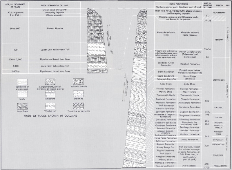 THE ROCKS of Yellowstone National Park, separated into individual units or formations and arranged according to their geologic ages (see fig. 6). A formation is a body of rock that contains certain identifying features (such as composition, color, and fossils) which set it apart from all other rock units. The identifying features of each formation provide valuable clues bearing on its origin. Most formations are given formal names, and usually each formation is thick and widespread enough to be recognized over broad areas. Some, however, change character from place to place, and different names may be used in different areas even though the rocks represent the same geologic time interval. (Fig. 5)