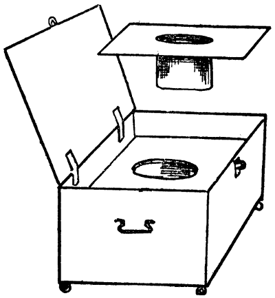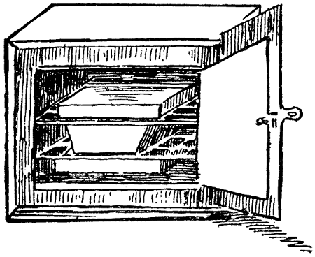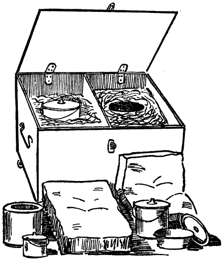 The box may be an unpainted one such as can be obtained for a few cents from any store where[10] one of suitable size and shape is used, or it may be a handsome hardwood chest, or even an old trunk. In selecting it, choose one made of sufficiently heavy boards to admit of having hinges and a hasp put on it. If it is to be used in a dining-room, or where attractive appearance is to be desired, it may be covered with chintz or denim, or a coat of paint, if not made of finished hard wood. An old ice-box, one that has a hinged lid at the top, has been utilized for this purpose with success. A barrel makes an excellent hay-box, especially for very large kettles, but the cover cannot easily be hinged and must, therefore, be weighted to hold it down tight. In size the box should be from two to five inches larger in every dimension than the kettle it contains. The kettle is, therefore, the first thing to be secured, and full directions for choosing it are given on page 13. The next point to consider is the packing material. When this has been chosen, the directions for packing the box, given on page 15, will tell how much space must be allowed for insulation and, consequently, of what size the box must be. If it is so large as to admit of more insulation than that absolutely required, there is no objection, only a possible gain. If it is intended to pack the box with more than one utensil this will also have a bearing[11] upon its size. Allow nearly, or quite, double the insulation between the utensils that is provided on the other sides, otherwise there may be difficulty in removing one utensil while the other is still cooking.