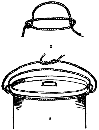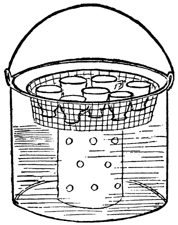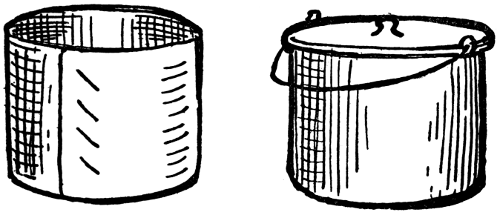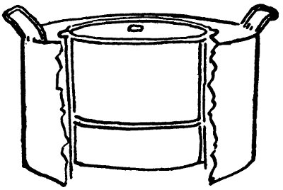 The utensils. Perhaps the best shape for the cooking utensil, that is, one which will have the least possible radiating surface, is a pail about the depth of its own diameter. The sides should be straight and perpendicular to the bottom. The cover should fit securely into place. If a smaller utensil is to be used inside the large one, which is often a great convenience, it must not be so high that the cover of the larger pail will not go on. A “pudding pan” may be used for the inside utensil, resting on the rim of the pail; but care must be taken, with this arrangement, that a cover is secured that will fit the pan closely.