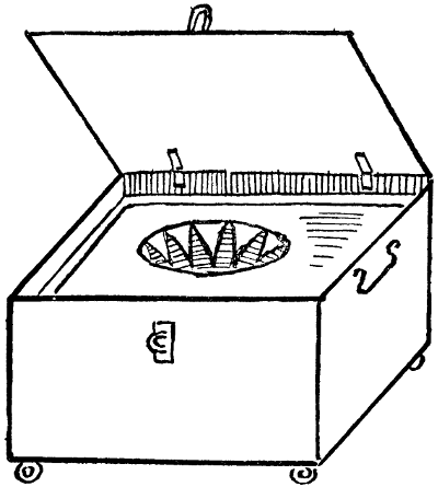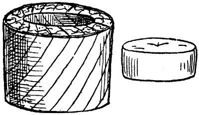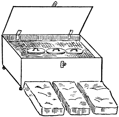 The packing material may be either hay, straw, paper, wool, mineral wool, excelsior, ground cork, Southern moss, sawdust, or any other non-conducting material that is adapted to filling the space between the kettle and the box. If hay is used, choose soft hay. Wool is, perhaps, the[12] best heat retainer of those mentioned, and it is easy and pleasant to handle. Clean, soft wool may be purchased at woollen mills and elsewhere. It should cost about thirty-five cents a pound, but as it is very light it requires much less, by weight, than of some other cheaper materials. Mineral wool can be purchased at large hardware stores. It costs about five cents a pound,[13] but about five times as many pounds are required as an equivalent for wool. Cheap cotton batting can be obtained at dry-goods stores; ground cork from large grocers. This is used by them as packing for grapes or other fancy fruits. Sawdust, obtainable at sawmills, and perhaps elsewhere, must be well dried before using. Excelsior is used by many kinds of merchants, and can be bought for about two cents a pound. Hay is plentiful in country places and can also be purchased at feed-stores in the cities. Southern moss, easily procurable in the Southern States, can be found at many upholsterers’ in the North as well. Newspapers and hair, such as is used by plasterers, are available in city and country.