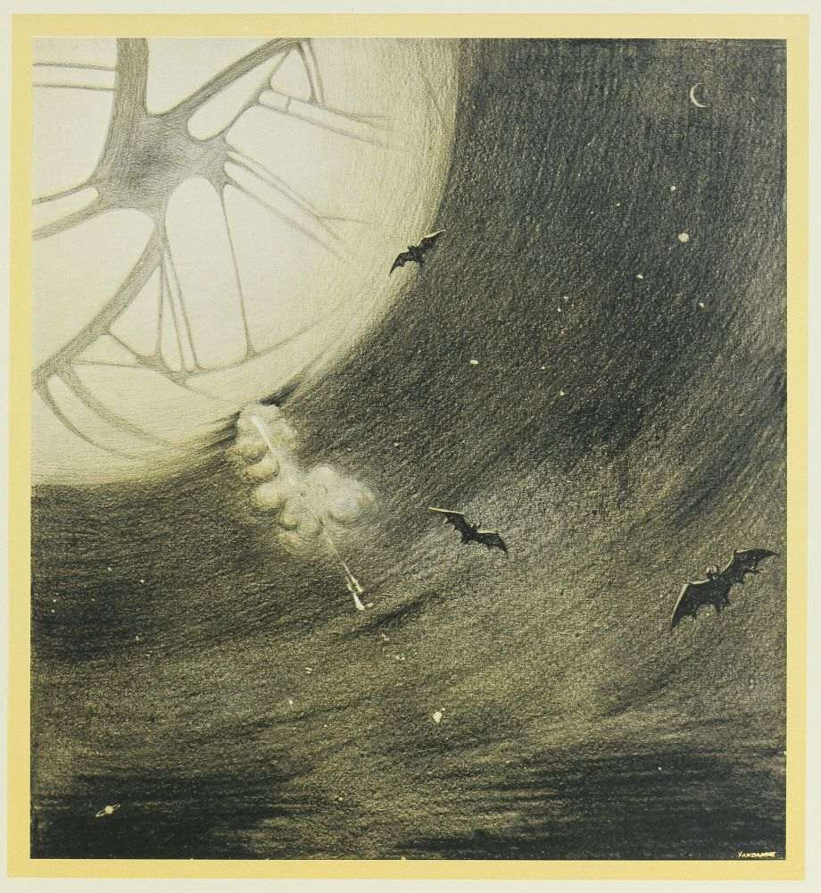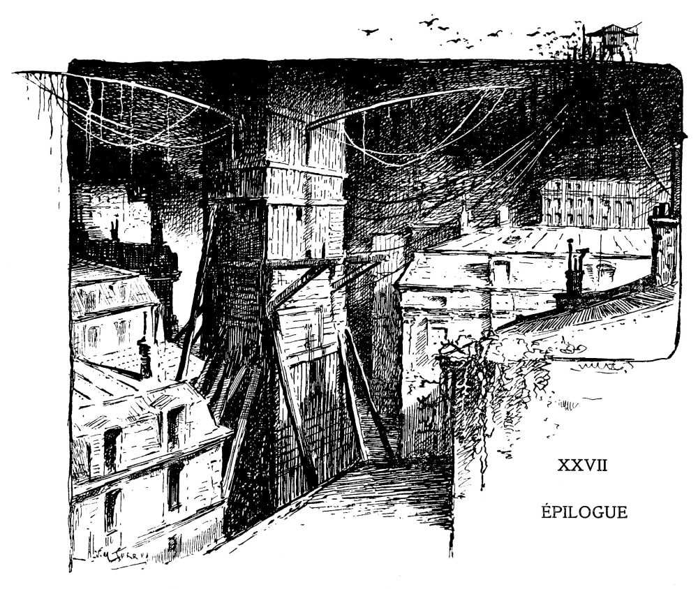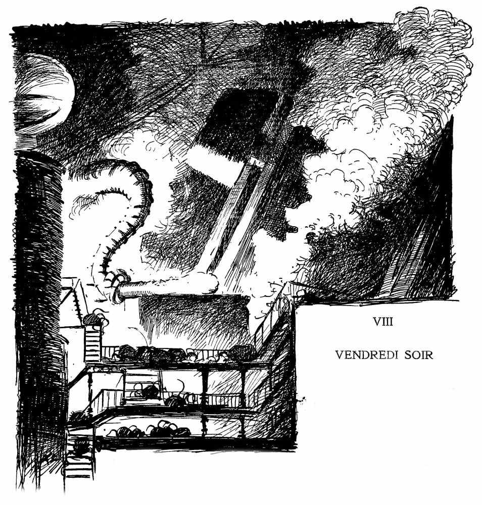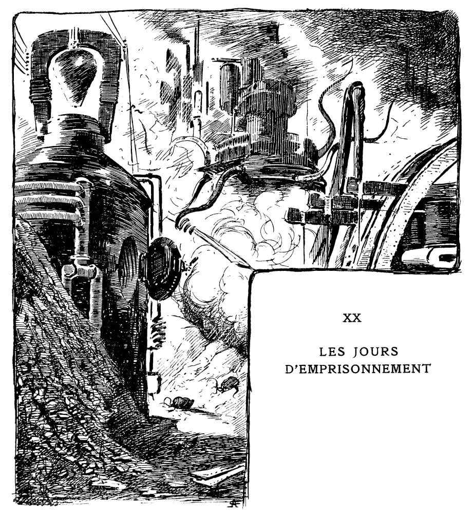 Une volonté insensée me poussait. Je voulais en finir, dussé-je y rester, et je voulais même m’épargner la peine de me tuer de ma propre main. Je m’avançai insouciant vers le titan; comme j’approchais et que l’aube devenait plus claire, je vis une multitude de corbeaux qui s’attroupaient et volaient en cercles autour du capuchon de la machine. A cette vue, mon cœur bondit et je me mis à courir.